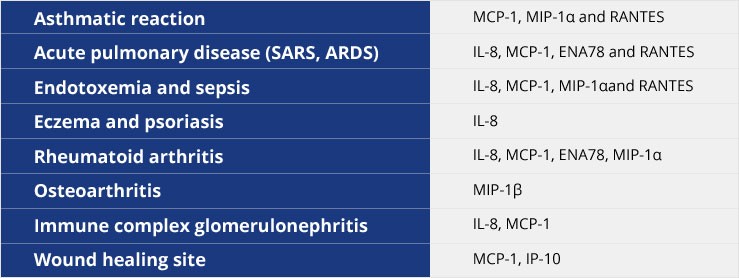 IL-8 is a potent chemokine for neutrophils, growth factor of epidermal cells, and a pro-angiogenic factor. Psoriasis is a common skin disease characterized by scales that are built up with rapid growing keratinocytes accompanied by inflammation and redness around the scales. IL-8 levels elevate up to 150-fold in psoriatic tissue, suggesting its role in the pathogenesis.